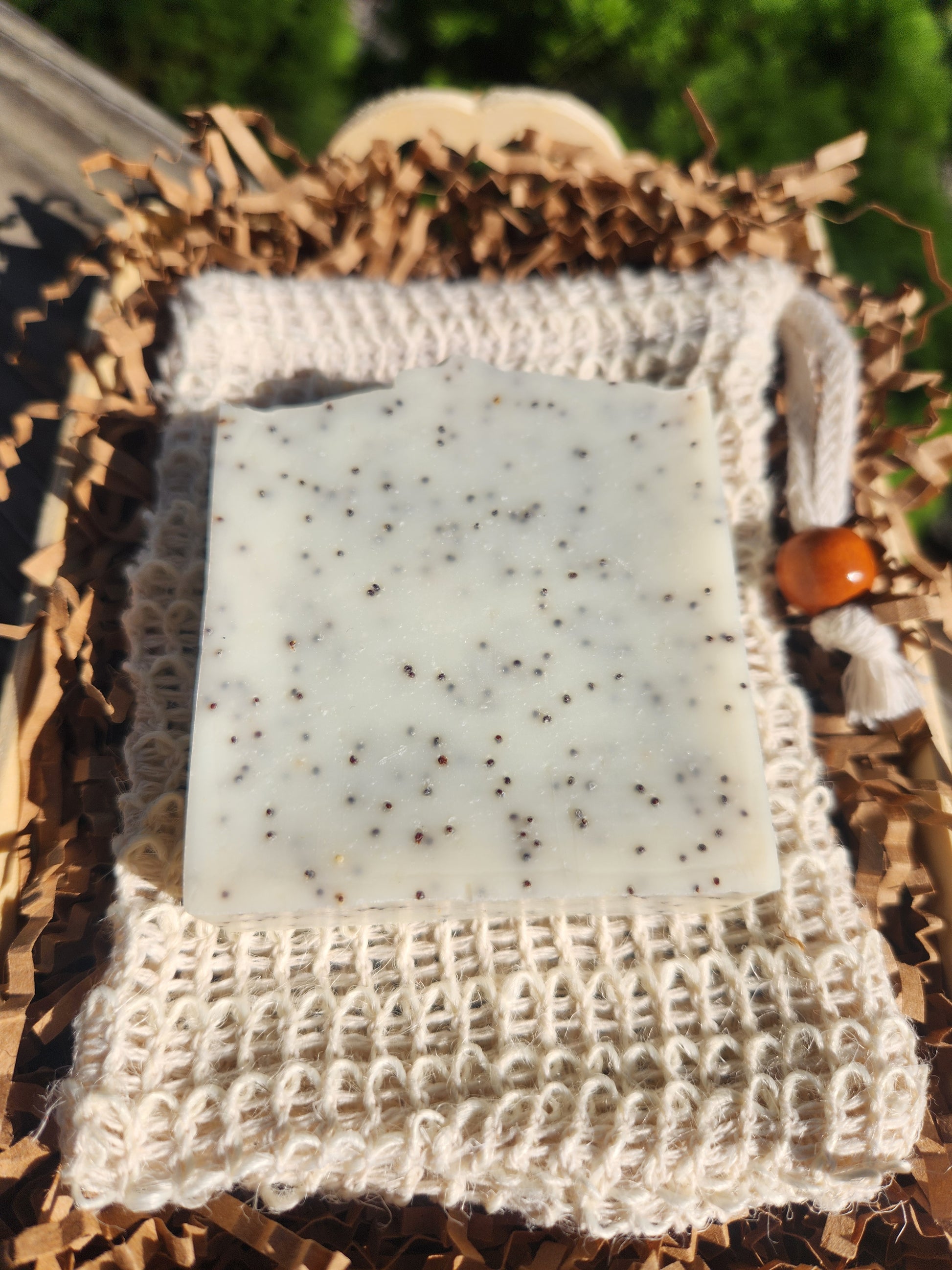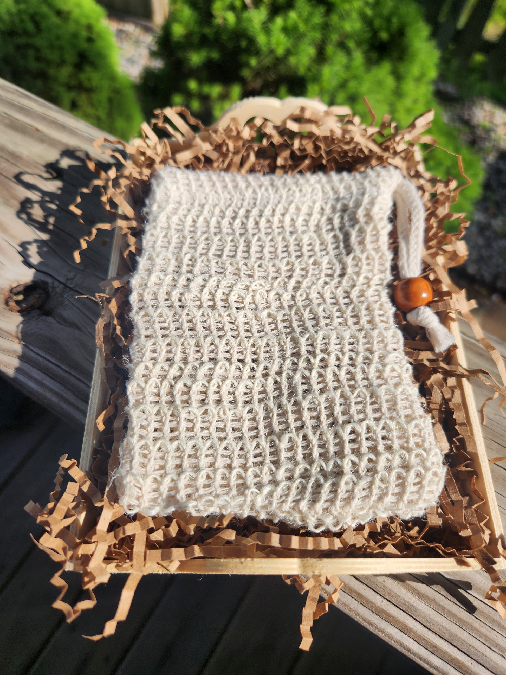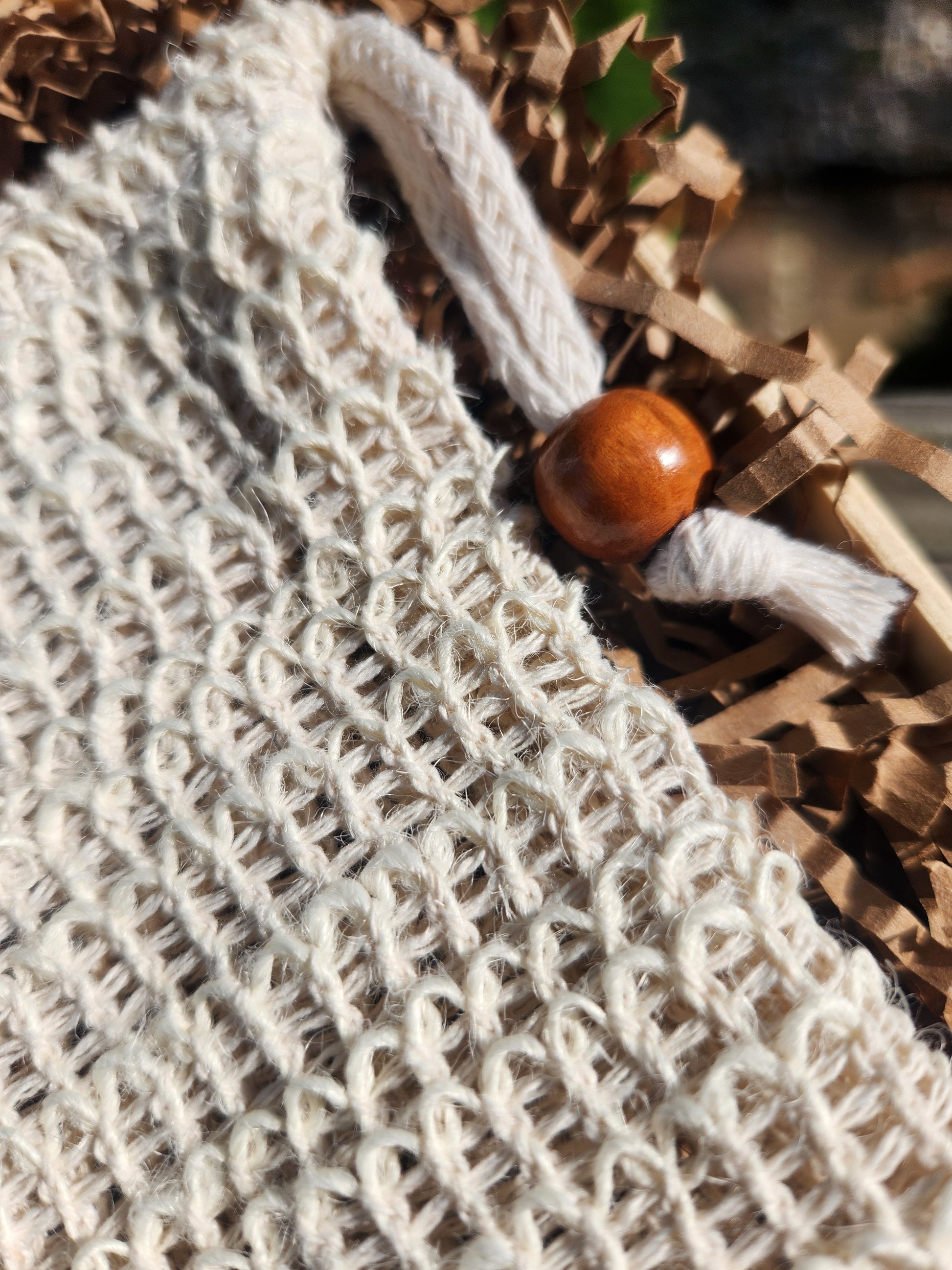 Our Soap Saver Bag is made up of Sisal material, which is 100% natural from the Agave plant. It is great for exfoliation and gently removing dead skin cells. Bag also preserves the life of your soap bar.